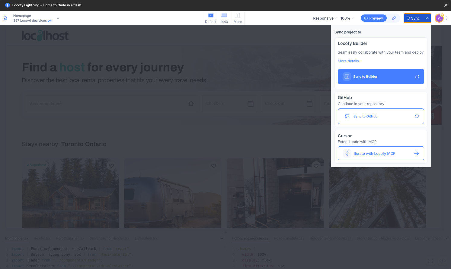 Sync to Builder (opens in a new tab): Sync your project to the Locofy Builder to configure code settings, review and edit the folder structure, collaborate with your team, access a live, shareable prototype & more.