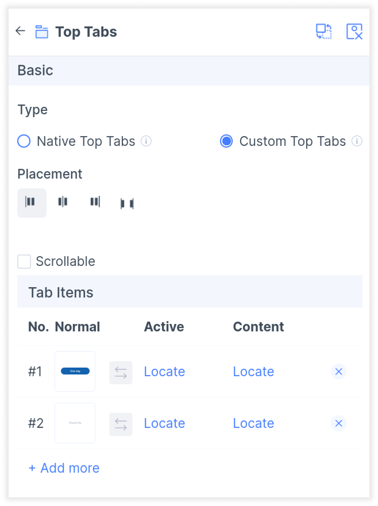 - As this is a custom design, select "Custom Top Tabs" in the editing tab.