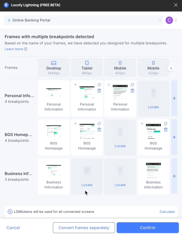 For example, if you have the following frames: “Homepage - Desktop,” “Homepage - Tablet,” and “Homepage - Mobile,” and you only select “Homepage - Desktop,” Locofy will automatically detect and map the other two breakpoint frames because of the naming convention.